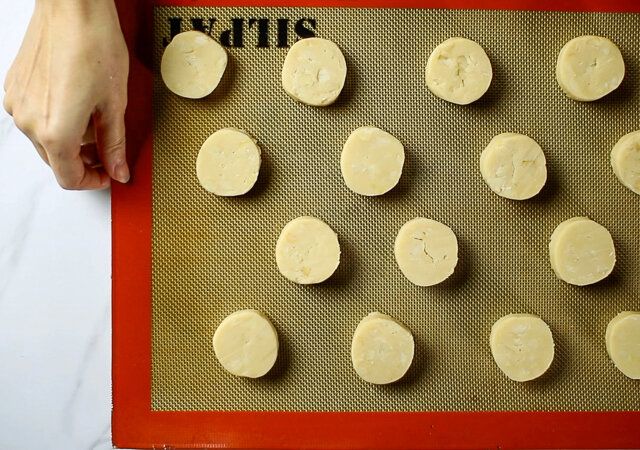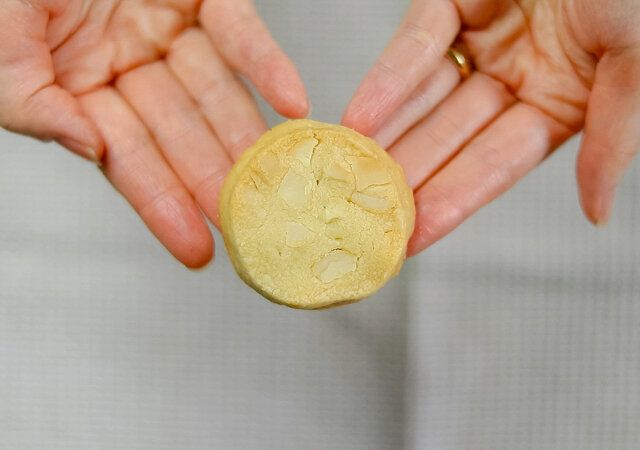 生地の水分が少なめでマカダミアナッツがたくさん入っているので、カットするときかたちが崩れてしまいがちです。アイスボックスクッキーですが冷凍ではなく冷蔵し、少し常温に置いてからカットすると綺麗に切れます。