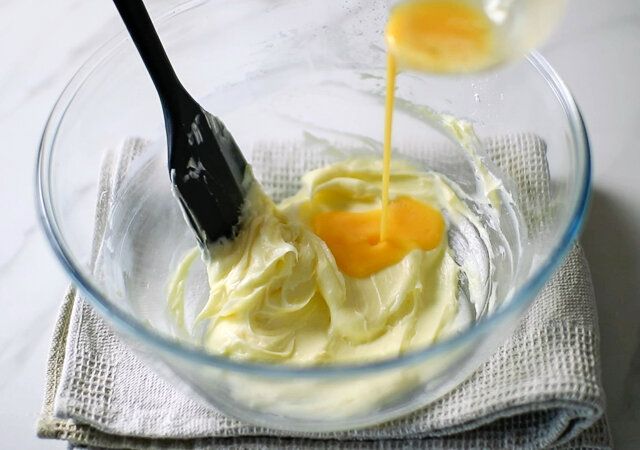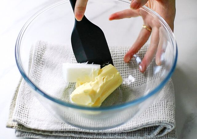 ① ボウルに室温において柔らかくしたバターとショートニングを入れ、ゴムベラでよく練り合わせます。
