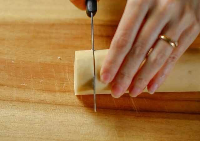 ⑩ 冷蔵庫から取り出して5分ほど常温におき、7〜8mmの厚さにカットします。まっすぐ切ってしまうとナッツが飛び出したりしてしまうので、ゆっくりとナイフを引きながらカットします。