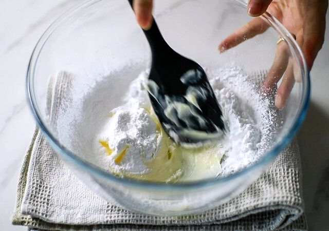 ② 粉砂糖をふるいいれ、引き続きゴムベラでよく混ぜます。