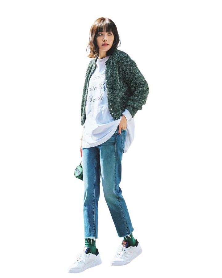 スニーカー¥17,600(アディダス/アディダスお客様窓口)ソックス¥2,750(ブルー フォレ/RHCロンハーマン)カーディガン[11月下旬入荷予定]¥18,150(ビューティー&ユース/ビューティー&ユースユナイテッドアローズ 丸の内店)ロンT¥12,100(ウィム ガゼット/ウィム ガゼット ルミネ新宿店)デニムパンツ¥45,100(マザー/サザビーリーグ)バッグ¥16,500(トフ&ロードストーン/T&L)