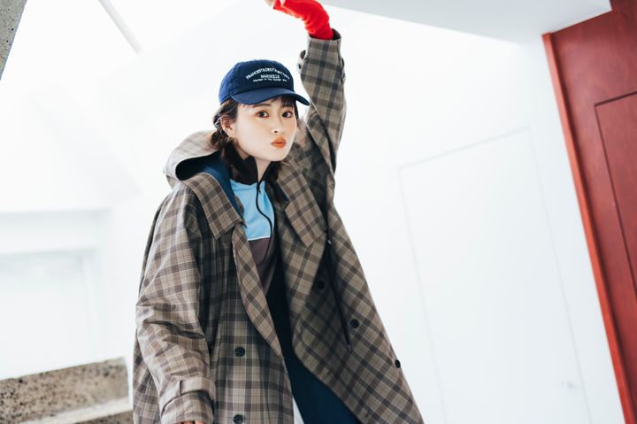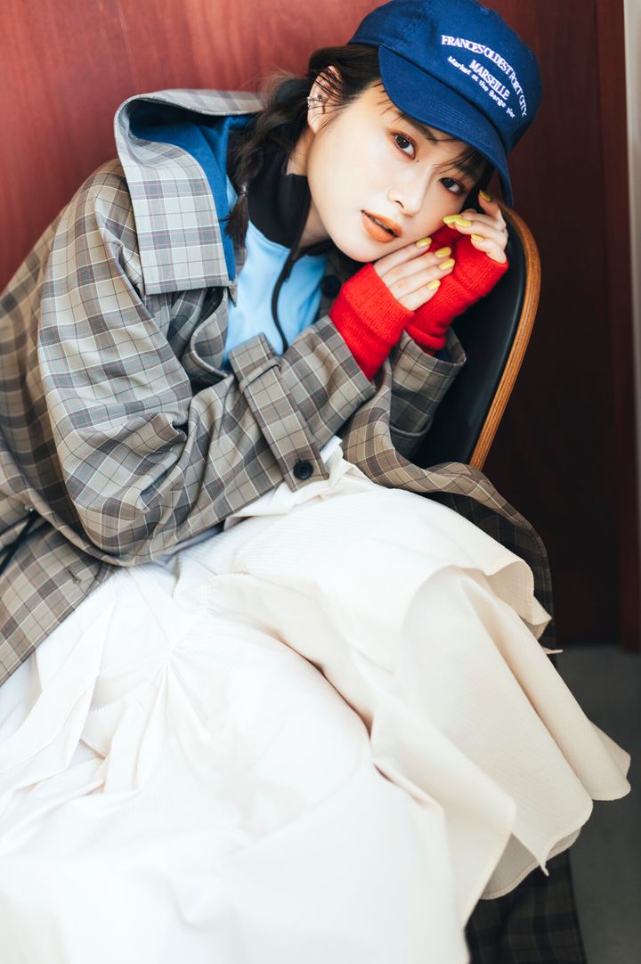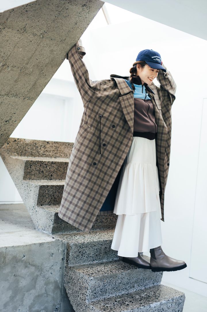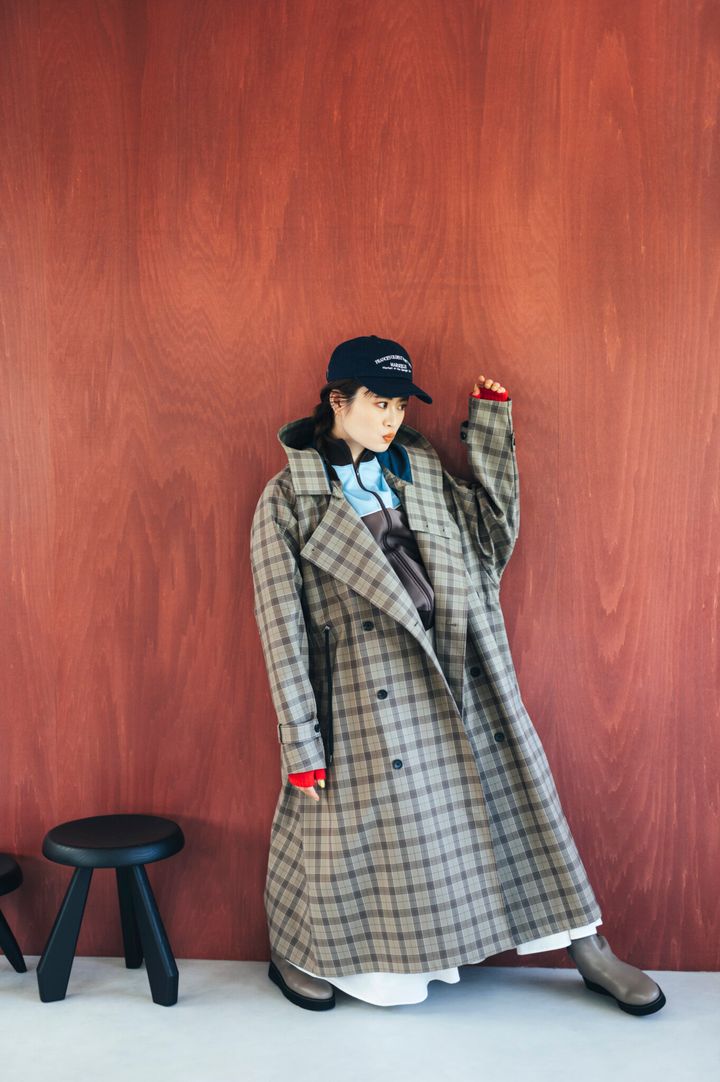 コート 103,400円(ヴァシュモン|ショールームリンクス03-4578-3421)/トップス 27,500円(ザ ハンサムhttps://the-handsome-brand.com)/スカート 11,500円(ココ ディール03-4578-3421)/ブーツ 29,150円(ダイアナ|ダイアナ銀座本店03-3573-4005)/キャップ 5,940円(シップス) 、グローブ 15,400円(ジョンストンズ オブ エルガン|共にシップス インフォメーションセンター0120-444-099)/右耳イヤーカフ 12,100円(ランバン オン ブルー|レリアン0120-370-877)/左耳イヤーカフ 20,900円、リング 29,700円(共にエネイ|エネイ松屋銀座03-6427-1030)