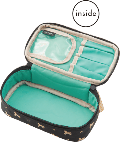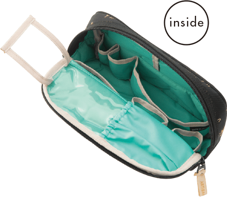 フラップ部分に4つのブラシホルダーが付いた、メインスペースに仕切りやポケットのないシンプルなメイクポーチ。ブラシポケット部分のクリア素材のカバーは、ブラシの粉がポーチ内に散らばらず、ポーチ内をキレイに保てるための配慮。ユーザーの使いやすさを徹底的に考え抜いた、モノ作りへのコダワリを感じられます。