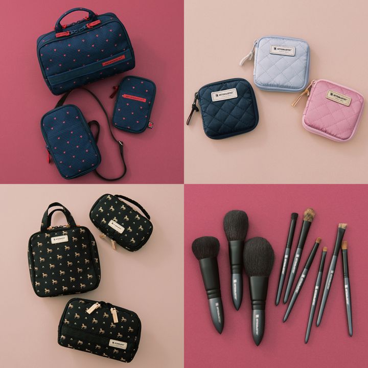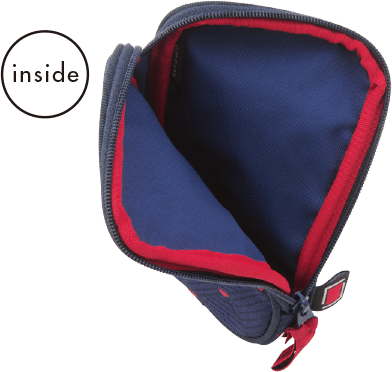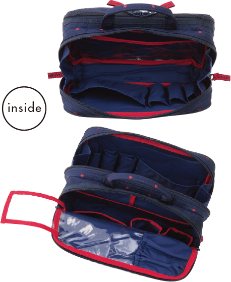 コンパクトながら収納力を確保するため、トップからポーチの側面にかけて、なだらかな傾斜にカッティングされた独特なフォルムが特徴的な人気のデザイン。ファスナーを開くとフロントのブラシホルダー部分が手前に倒れる作りなので、中が見やすく、出し入れもスムーズ。中でしっかりコスメが固定できるポケットも充実。