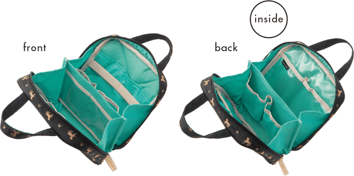 ブラシ入れをはじめ、大小さまざまなポケットの付いたメインスペース2つが共存した、ブランドで人気の大容量タイプ。片側にスキンケア、もう一方にメイクもの……とジャンルごとに収納して、旅行へ持参するにもピッタリ。通帳やパスポート、長財布も入る大きさなのでミニバッグにしてお出かけしたり、バッグインバッグとして使うのも◎。