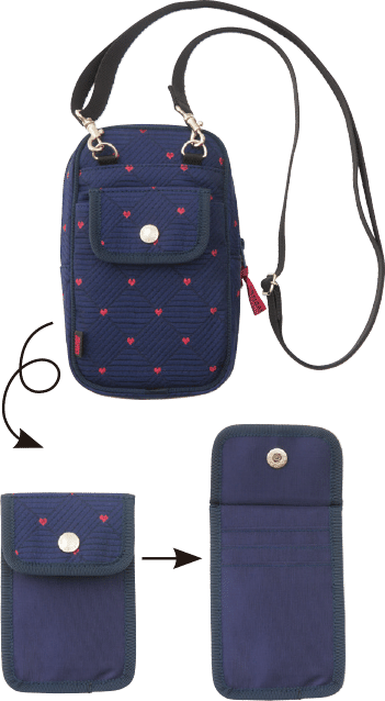 取り外しができるショルダーストラップが付いた、ポシェット&ポーチとして使用できる2WAYタイプ。一見シンプルなデザインですが、背面のオープンポケットにはスナップボタンで着脱可能なカードホルダーが付属されていて、キャッシュレス派には嬉しいポイント。このポシェットひとつで手ぶらでお出かけできちゃいます。