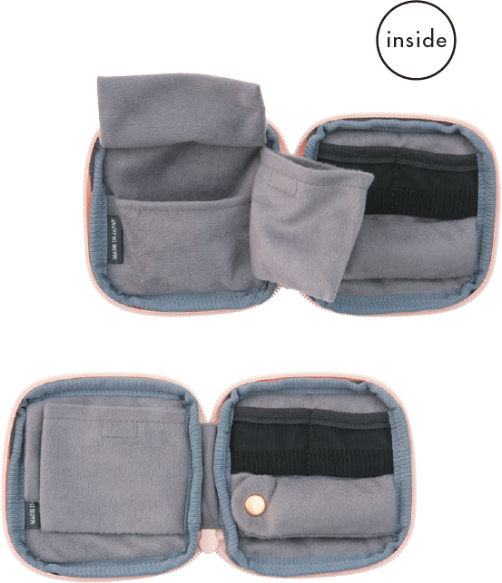 ジムや旅行先で着け外しする大切なジュエリーを、柔らかな生地で優しく守りコンパクトに収納できるポーチ。ファスナーを開くと見開きになるため出し入れしやすい構造です。リングは専用のホルダーに、ネックレスはフタが付いたポケットへetc. 細部まで使いやすさを徹底的に考え抜かれた、クラフツマンシップを感じさせる逸品。