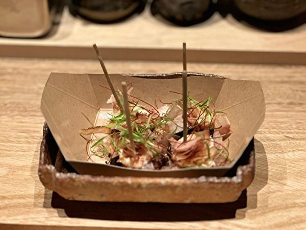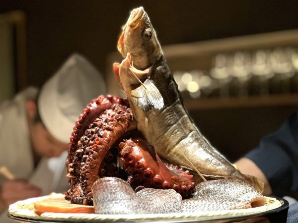カウンター中央に置かれた大きな火鉢の炭で炙っています。 まさに五感で楽しめる料理が登場します。