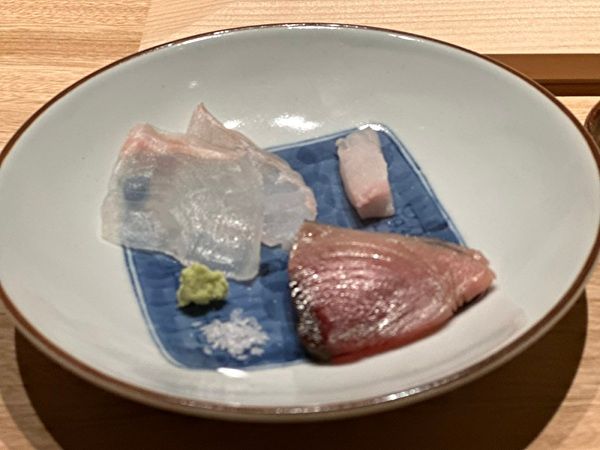 マツカワガレイとスマカツオ、右上はエンガワです。薬味はわさびとイギリスのマルドン塩です。スマカツオは普通のカツオとは違い、奥の深い味で、身が引き締まっています。マルドン塩で頂きます。