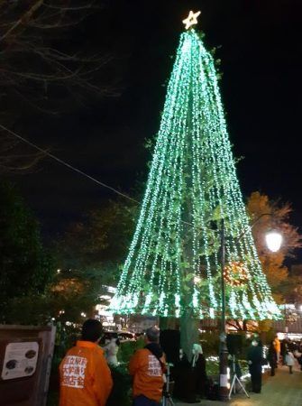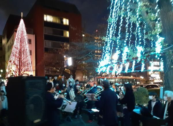イルミネーションは12/2(土)から点灯しています。点灯式では、国立駅南口の大学通りスターバックス前にたくさんの人が集まり、国立音大附属中学・高校の吹奏楽部と合唱部の生徒さん約40名による演奏・合唱と、カウントダウンがありました。 (ファンファーレのメロディーは作曲専攻の生徒さんが考えたオリジナルです♪)