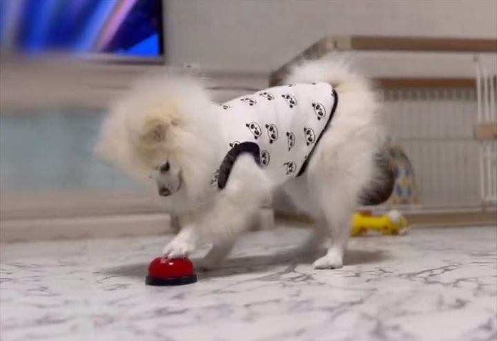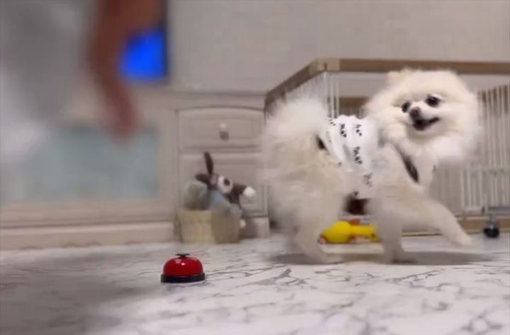 3. ベルを鳴らすポメラニアン。鳴らすとお姉ちゃんとおいかけっこができるのが楽しくて、何度も繰り返しちゃう!!