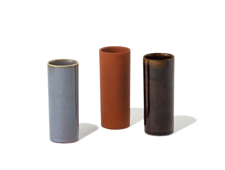 すっと佇むモダンなデザインを、伝統的な色で仕上げた湯呑み。7色展開で、それぞれ釉薬や焼成方法が異なるのも面白い。左から、辰砂、赤土焼き〆、飴釉。一輪挿しとして使っても。各¥2,750(Sゝゝ[エス])