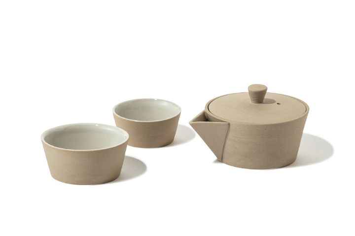宝瓶と呼ばれる持ち手のない急須に、大小2つの碗がすっぽりと収まるユニークな茶器。茶葉とお湯の入った水筒、そしてこのセットとともに外に出かけ、空の下で丁寧に淹れたお茶を味わいたい。入子茶器¥11,990(南景製陶園)