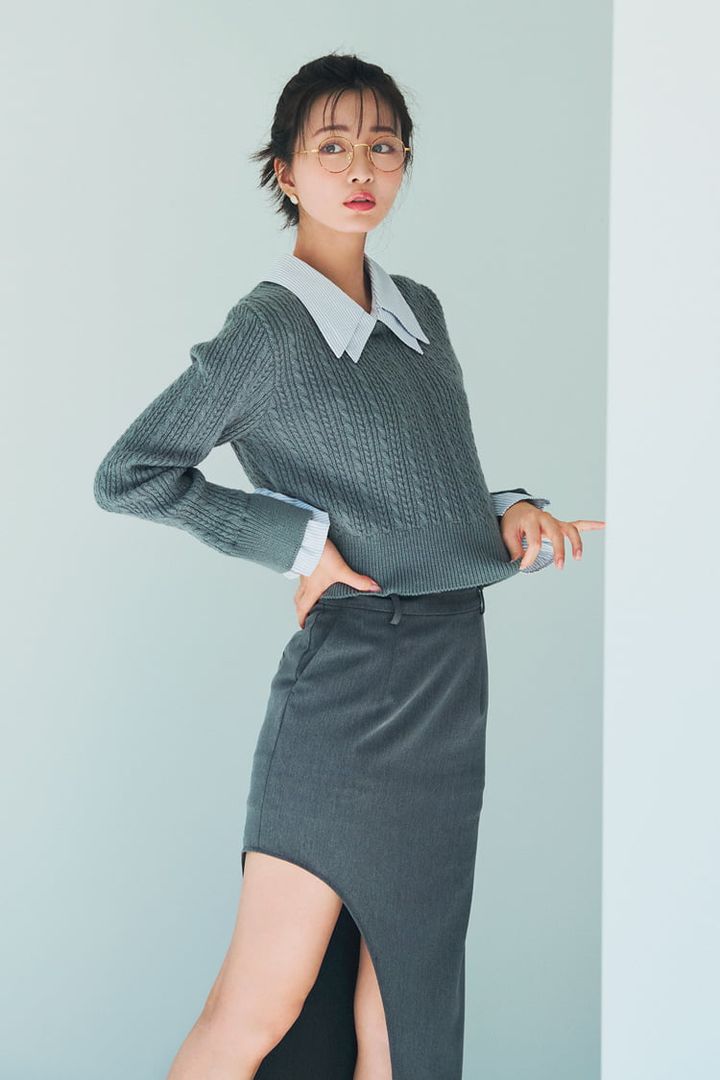 グレースリットデザインスカート 11,000円/Darich(YSM) グレーケーブルドッキングニット 8,690円/dazzlin メガネ 19,800円/Double Lovers(スクリーンショット) イヤリング 3,960円/ミミサンジュウサン(サンポークリエイト)