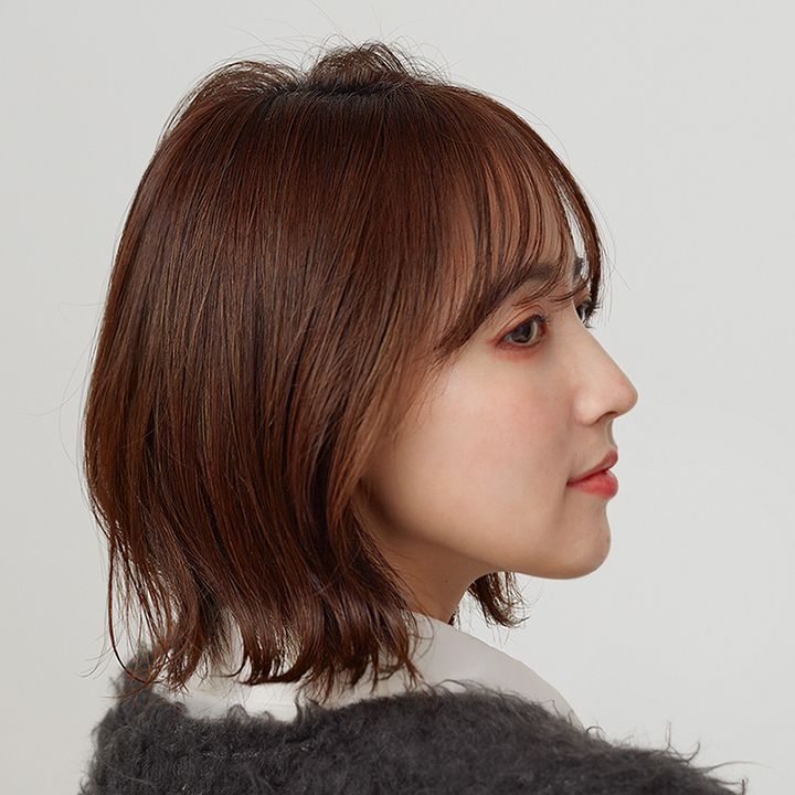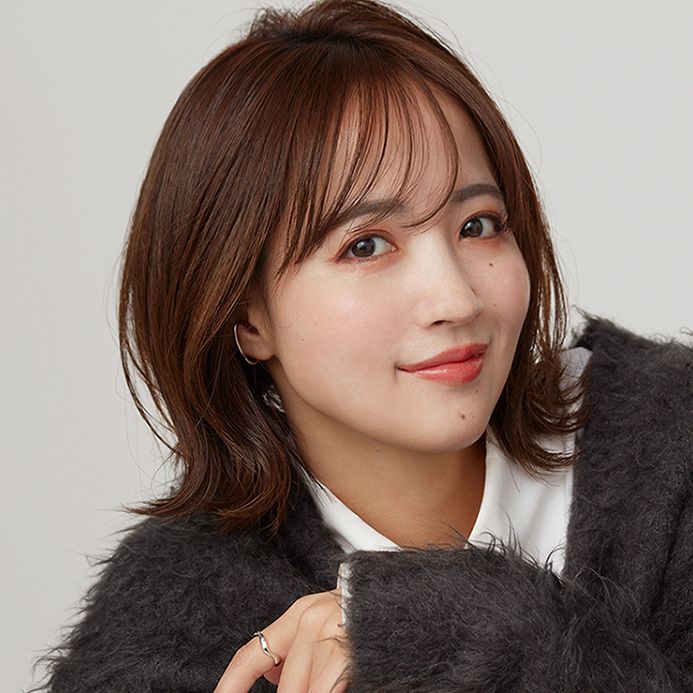 肩にギリギリつくかどうかというレングスに、ちょいハネはさりげなく可愛さが効くコンビネーション。ボブの内側の髪をすいておくことがポイントになるそうで、バームを少量なじませてスタイリングします。