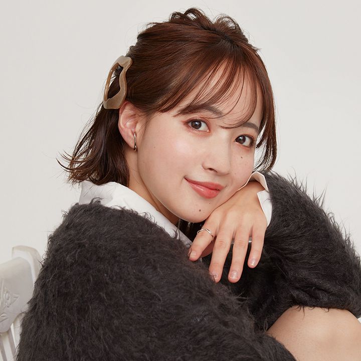 前髪は薄め×細めのシースルーバングに。ニットのボリュームを中和して全体の印象を華やげるのにひと役です。このふんわり感を出すには、顔まわりの毛束を軽くアイロンを通して内巻きにするのがおすすめ。
