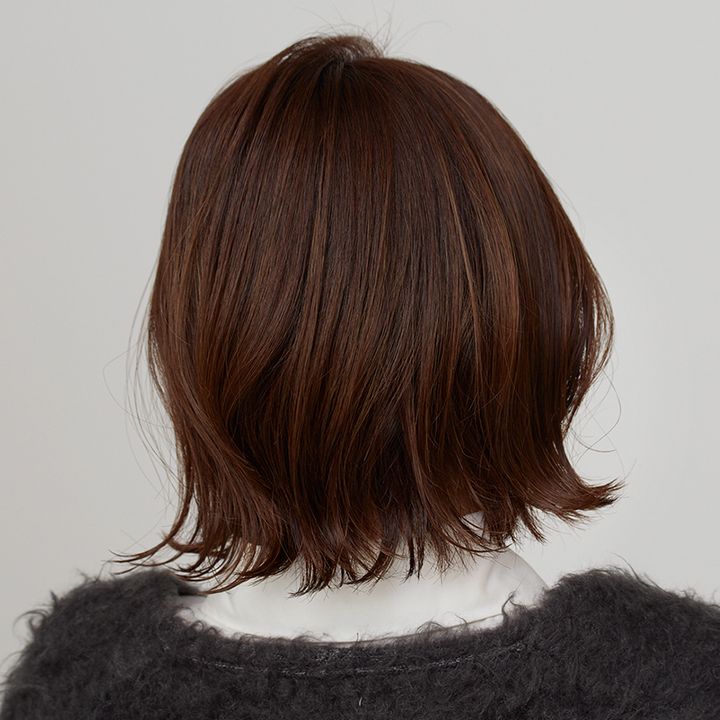 後ろから見ると表面の髪がふんわりと揺れているのがわかります。ボブの毛先がやや先細な質感になっているのが、ニットのシャギーな質感と絶妙にハモっていい感じ! バームを表面だけでなく内側もしっかりつけるのが秘訣です。
