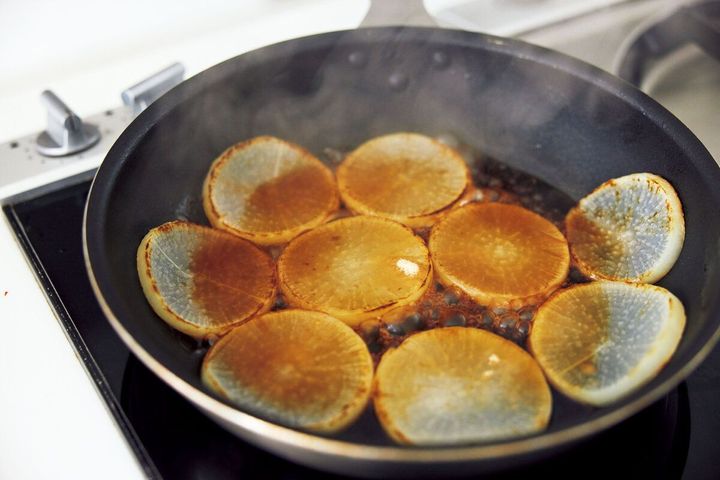 (1)大根はよく洗い、皮つきのまま幅7~8mmの輪切りにする。フライパンに入れ、Aを加えてふたをし、中火にかける。煮立ったら火を少し弱め、大根が透き通ってくったりするまで30分ほど煮る。