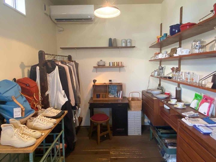 カフェスペースの端っこには、アパレルや食器などの物販コーナーが。ピンバッジやフランスの紙製品など、雑貨屋さん好き&雑貨集めが趣味の人のアンテナが反応しそう。