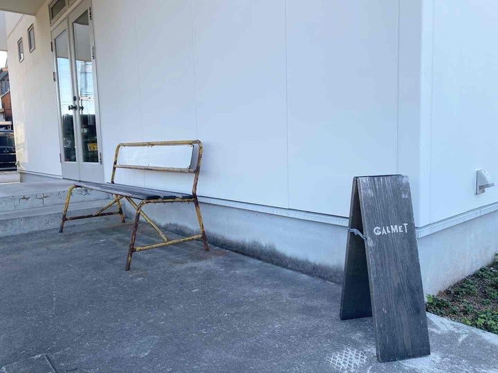 立山町にあるカフェ「CALMET」の外観はシンプル。アンティーク感のある看板が目に留まり、立ち寄りました。