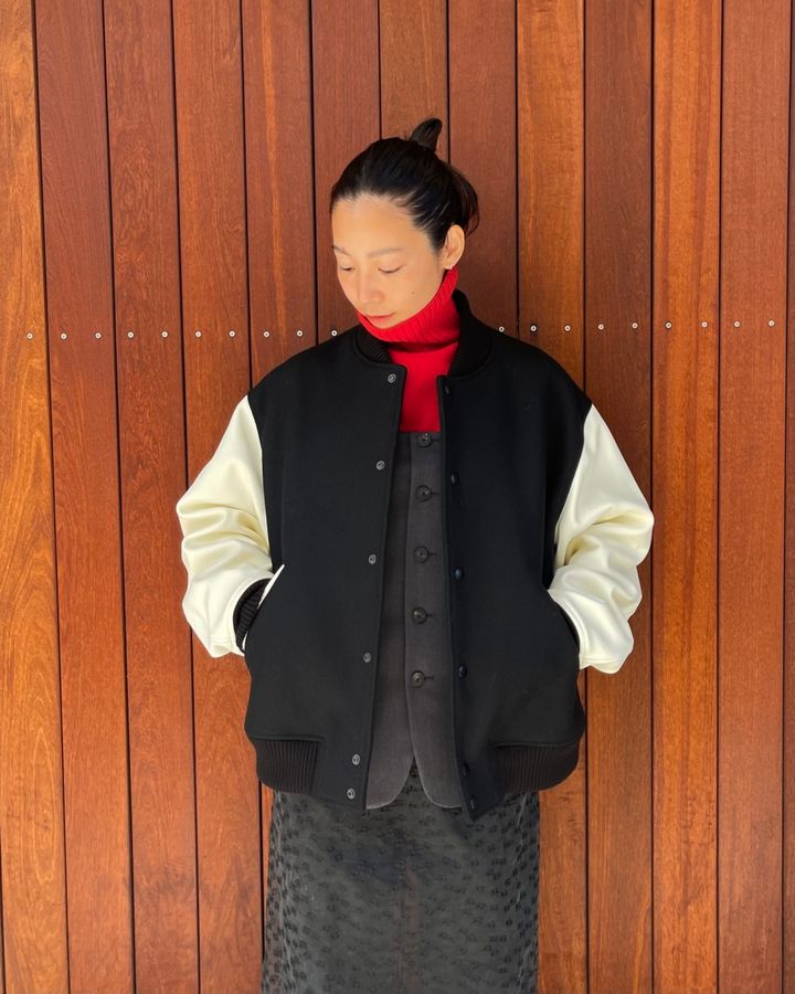 「ユニセックスのサイズ展開をしているロエフのスタジャン。メンズも着られる大きいサイズをチョイスしオーバーサイズで着ています。身ごろはメルトン素材、袖はラムレザーなのでスポーティ過ぎず上質感もあるのがロエフならではで気に入っています」スタジアムジャンパー¥96,800(ロエフ/エイチ ビューティー&ユース)