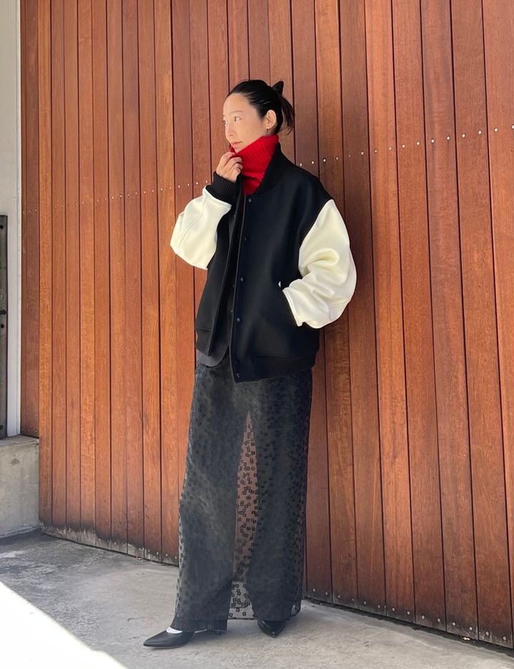 スタジアムジャンパー¥96,800、ビスチェ¥29,700、スカート¥26,400※1月中旬発売予定、EC予約販売中(全てロエフ/エイチ ビューティー&ユース)、ニット¥14,850(ビューティー&ユース/ユナイテッドアローズ 渋谷スクランブルスクエア店)、デニム¥11,000(マルゥ ユナイテッドアローズ/ユナイテッドアローズ カスタマーサービスデスク)、Gianvito Rossiのパンプスは本人私物