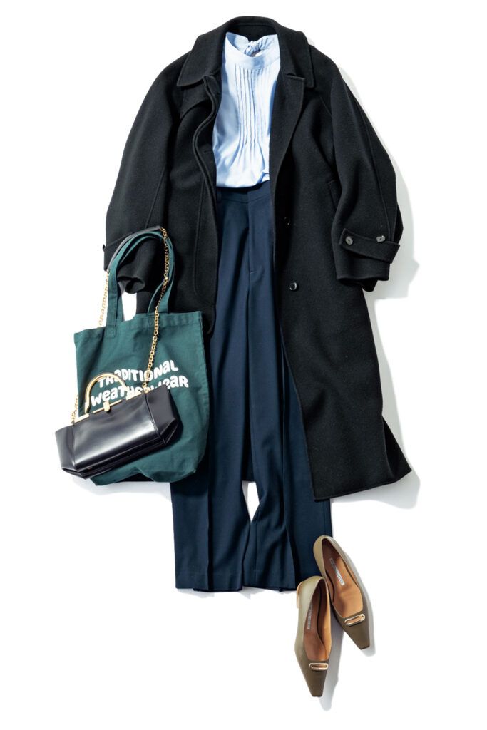 とろみブラウス着回し ピンタックパンツ¥13,090(ザ・スーツカンパニー/スーツスクエア TOKYO GINZA店)ロングリバーコート¥75,900(デミルクス ビームス/デミルクス ビームス 新宿)チェーンバッグ¥184,800(ザンケッティ/八木通商)トートバッグ¥4,400(トラディショナル ウェザーウェア/トラディショナル ウェザーウェア ルミネ有楽町店)パンプス¥69,300(ペリーコ/アマン)