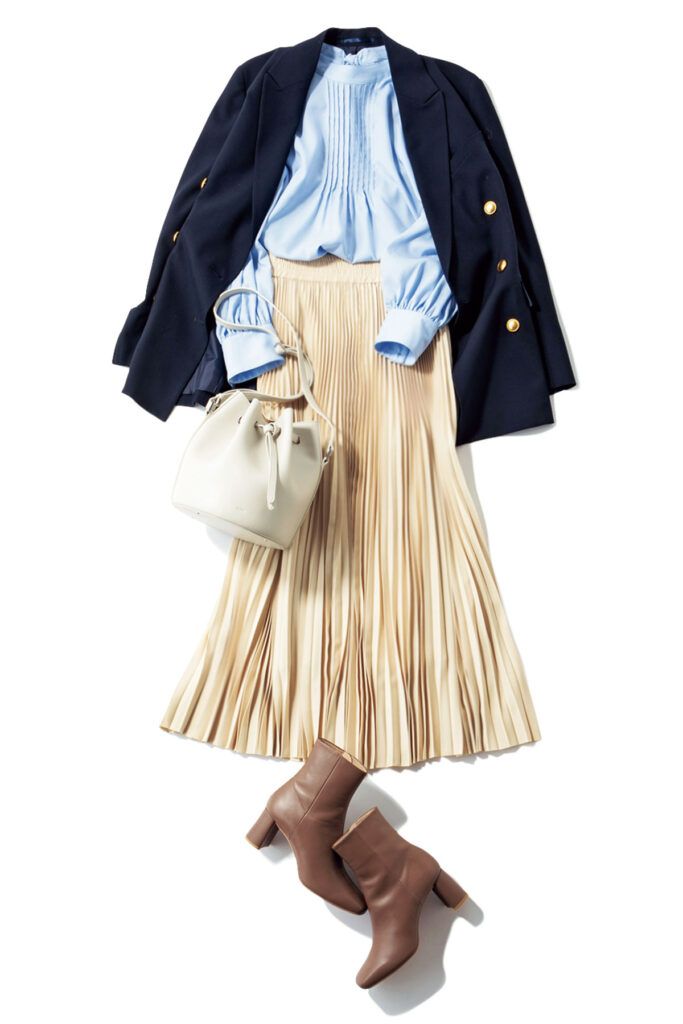 とろみブラウス着回し 金ボタンの紺ブレ¥20,900(ザ・スーツカンパニー/スーツスクエア TOKYO GINZA店)プリーツスカート¥38,500(ハイク/ボウルズ)バッグ¥45,100(ヴァジック/ヴァジックジャパン)ブーツ¥27,500(ダイアナ/ダイアナ 銀座本店)