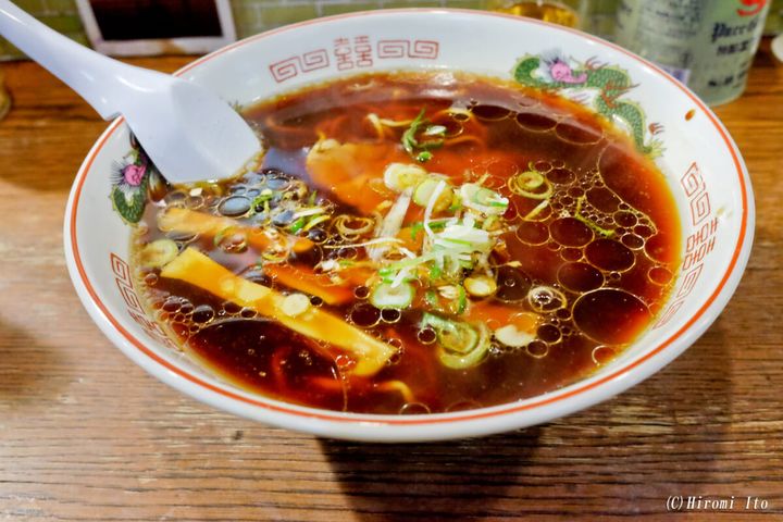 つぶ焼きの後にいただくのは、醤油ラーメン。真っ黒の濃い醤油ラーメンで、これもまた癖になるのです。