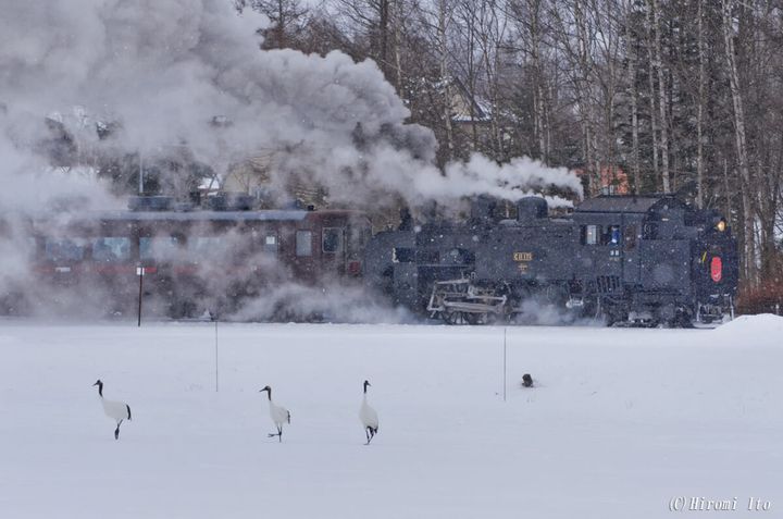 釧網本線の茅沼(かやぬま)駅も、タンチョウが訪れる駅。茅沼駅にはタンチョウの餌場があり、冬になると、駅にタンチョウが来るのです。蒸気機関車は、タンチョウを驚かせないために、汽笛を鳴らさずゆっくり発車します。