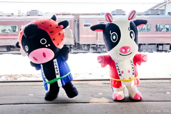 標茶駅では、蒸気機関車の到着と発車に合わせて、たくさんのおもてなしでにぎわいます。標茶町のPRキャラクターであるハッピーくろべえと、ミルクックさんも遊びにきます。