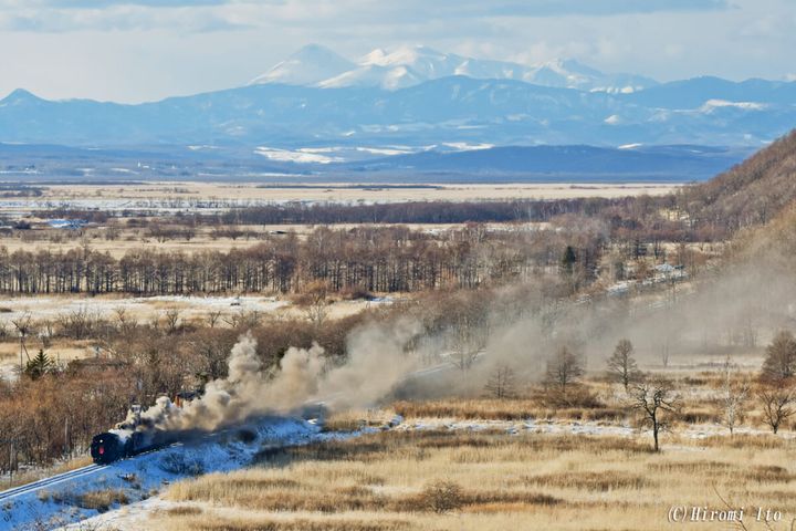 釧路湿原の間にある丘陵を蒸気機関車は力強く進んでいきます。