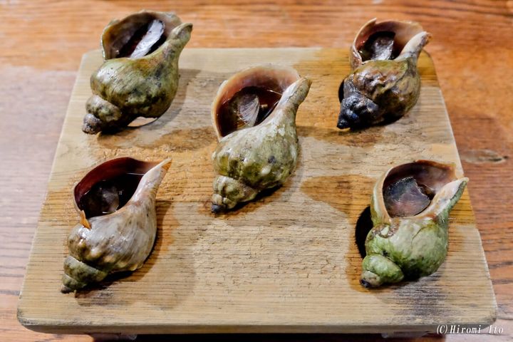 きれいに取れるとうれしいですが、最後までうまく引き出せない時は、木の板の上で貝殻をトントンと叩いて出します。沁みたタレがとてもおいしいので、食べた後は、貝の中に残ったタレを先っぽから丁寧に啜ります。
