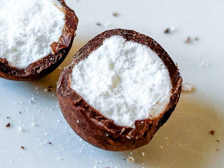 半分に割ってみると、中身はラムネなので思ったより硬め。中には真っ白いラムネが入っていました。食べてみると、ラムネはベーシックな爽やかな味。甘く濃厚なチョコレートとの組み合わせは、意外にもぴったりでした!