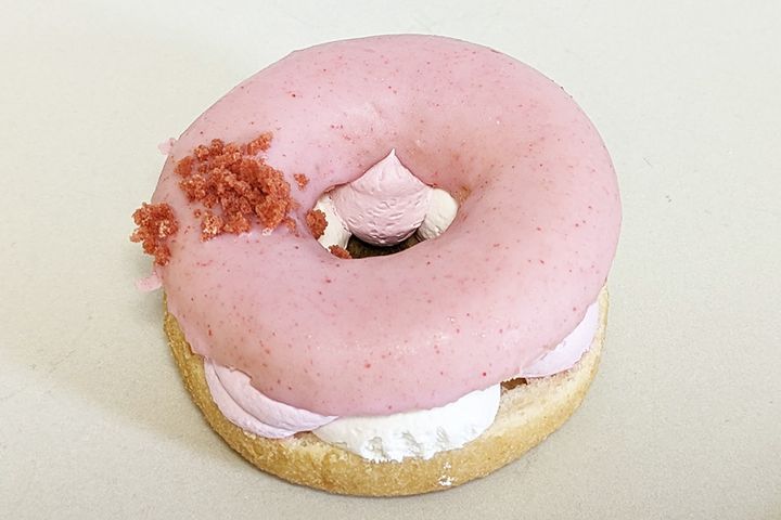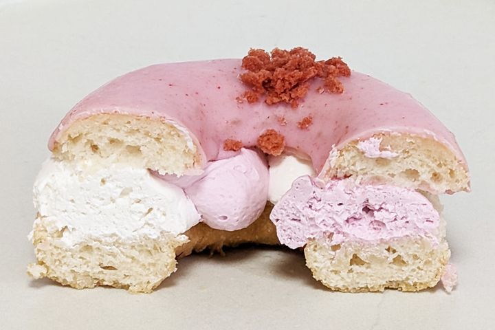いちご風味のチョコレートでコーティングされたドーナツで、クリームをサンドしています。
