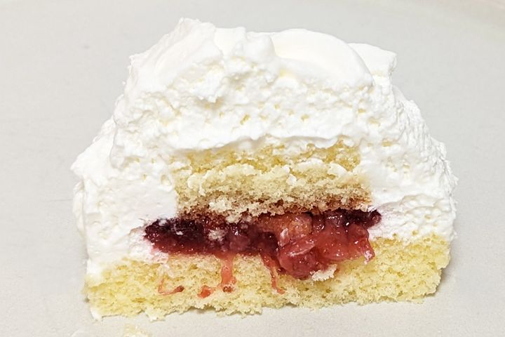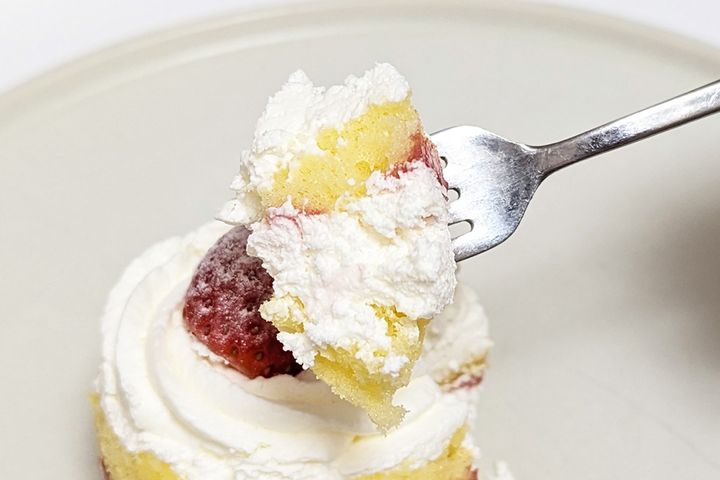 そんなケーキを半分に切ってみると、中心部分にいちごソースが入っていました。しかも、見ただけで果肉感たっぷりなのがわかります。たっぷりのクリームと一緒に食べるとおいしいはず、と思いつつ、まずはクリーム単体で食べました。商品名の通りふわふわでス~ッと溶けていきます。続けて、待ちに待ったクリームといちごソースを一緒に食べると、安定のおいしさ! この安心感のあるおいしさ、やっぱりいいですよね。クリームをメインに楽しみたいかたにオススメのスイーツです、