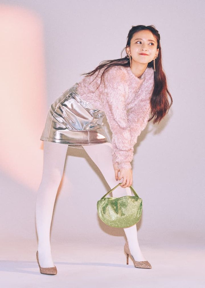 ピンクラメニット 7,150円/RESEXXY シルバーミニスカート 7,990円/Gap イヤリング 1,650円/パリスキッズ 原宿店 バッグ 8,990円/MANGO(LOCONDO) 白タイツ 1,210円/靴下屋(Tabio) パンプス 8,900円/チャールズ&キース(チャールズ&キース ジャパン)
