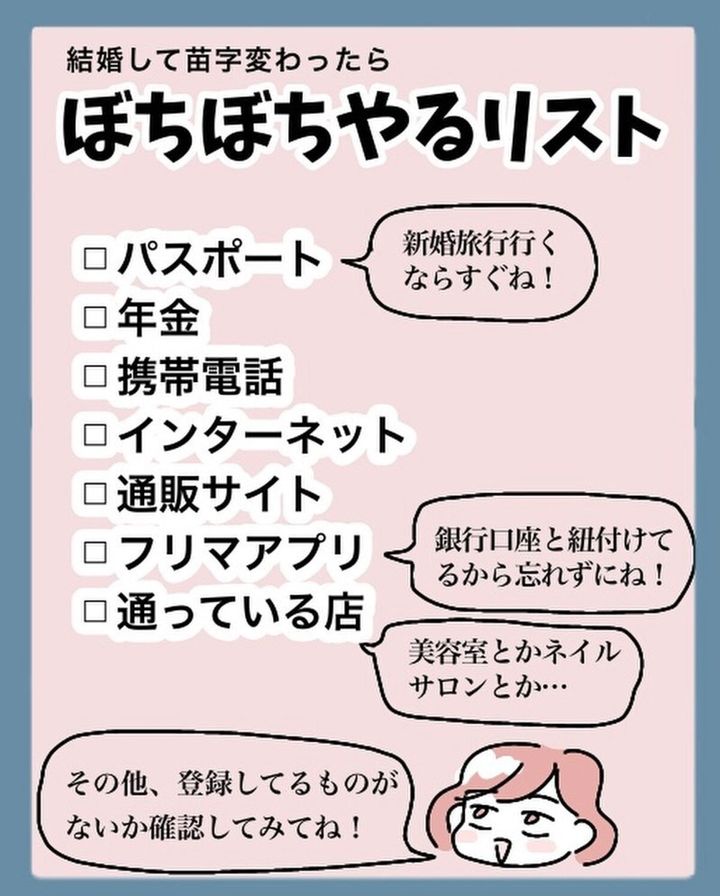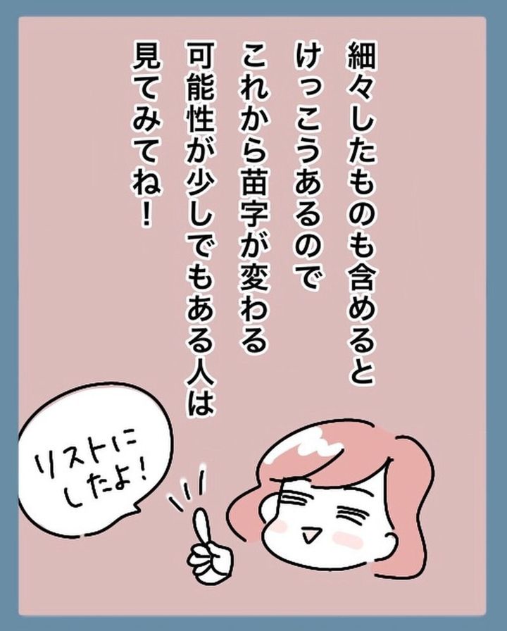 苗字を変えたらそれで終わりというわけではないですよね。そこから公的なものから個人的に契約・登録しているものまで、あらゆる名義を変更しなければなりません。みぃ子さんは名義変更が必要なものを、「すぐやるもの」と「ぼちぼちやるもの」と分かりやすくリストにまとめています。また、費用がかかるものもあるため、リストと一緒に保存しておくと便利ですね。