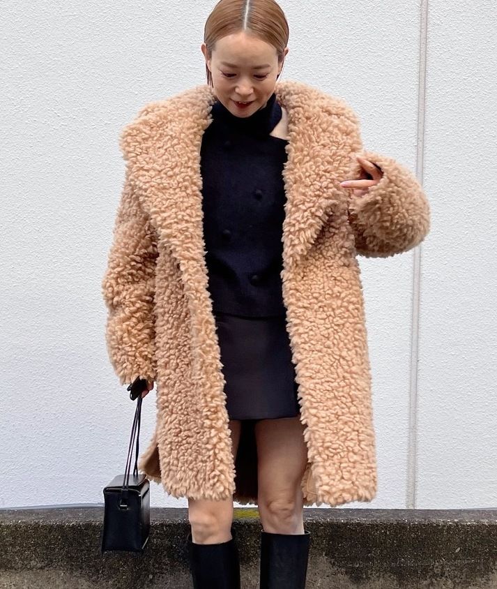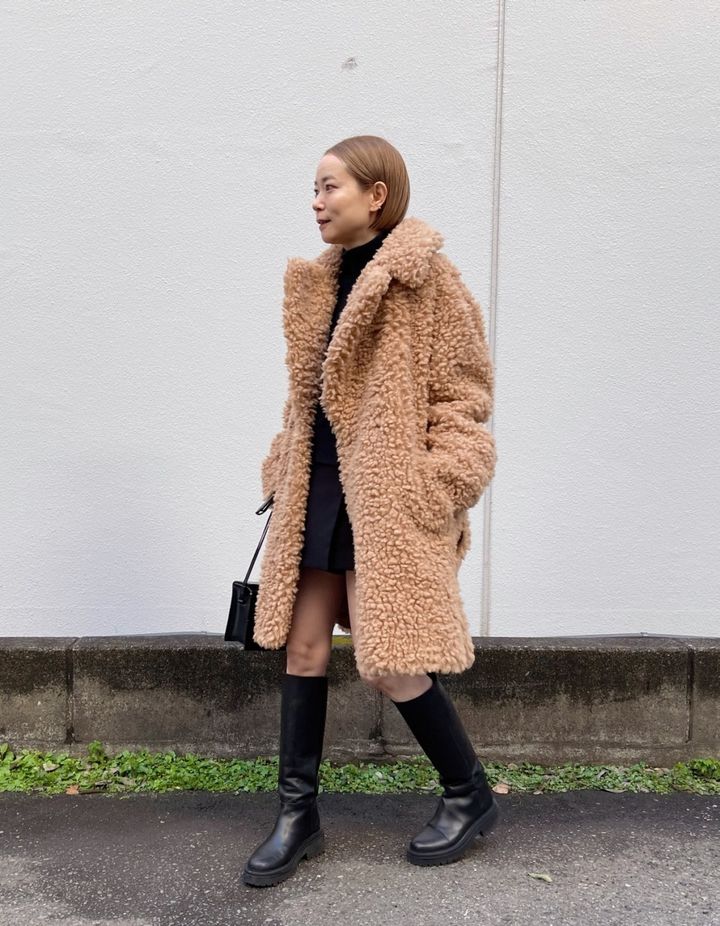 「もこもこのぬいぐるみみたいなヴェニットのボアコートは軽くてあったか! ヴェニットらしい計算されたボリューム感が女性らしくて、太めのパンツスタイルにもミニ丈にもぴったり。最近はオールブラックのミニ丈コーデがマイブーム。キャメルのコートが一層引き立ちます」