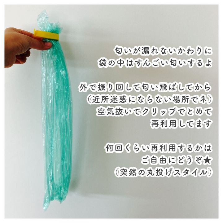 うちの夫ですが「驚異の防臭袋BOS」の一通りの使い方を伝えた翌日、思いっきり家の中でクリップをはずし振り回しておりました。とんでもないにおいを浴びてしまったようです。皆さま本当にご注意くださいませ。