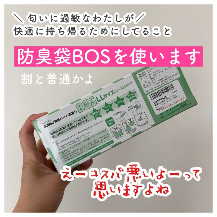 におい対策といえば傘袋やパンの袋を推す声も聞いたことがありますが、においに敏感な私としては、強烈なにおい対策にはBOSが頼りでした。