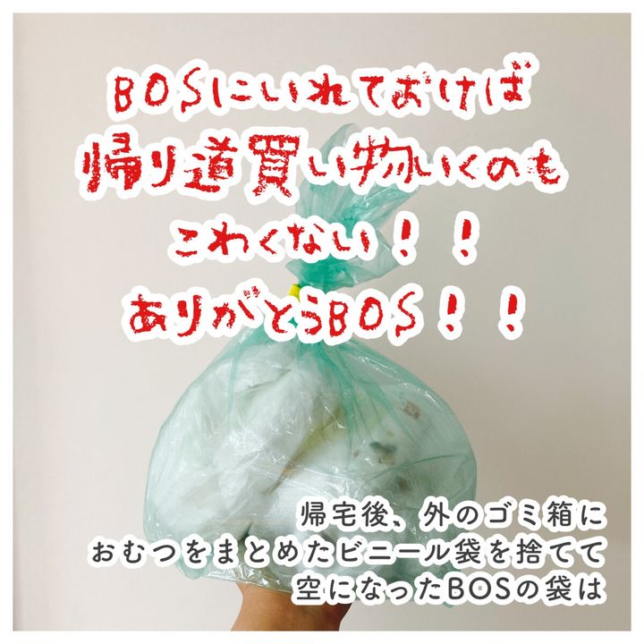 しかし、毎日のおむつ持ち帰り用の袋を「驚異の防臭袋BOS」にするとコスパが気になるところ。そこでわたしは「おむつが入ったビニールごとBOSに入れる」という方法に行きついたのです。