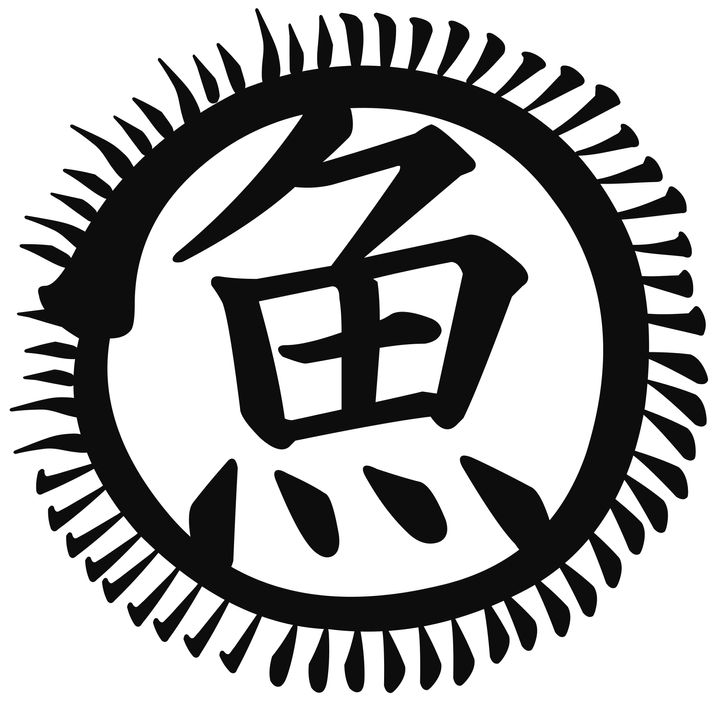 「魚」をトゲのついた丸いつくりで囲って、ある魚を表します。