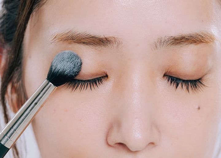 ポイントメイクを施す眉とまぶたにだけdをのせる。重ねるものが少ないほうが透明感が出るのでパウダーは必要最低限にとどめて。