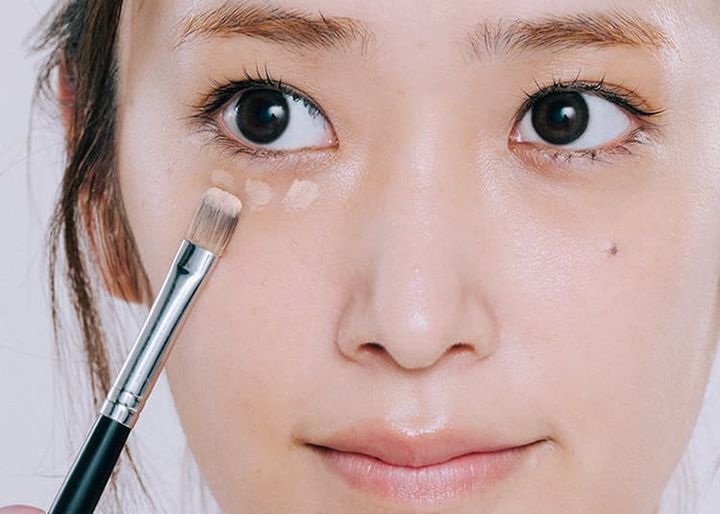 目の下などくすみが気になる部分にだけ、小さめの平筆でbを薄くのせ、スポンジでぼかす。自然な透け感を保ったまま、肌のトーンがアップ。
