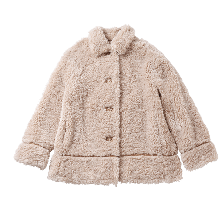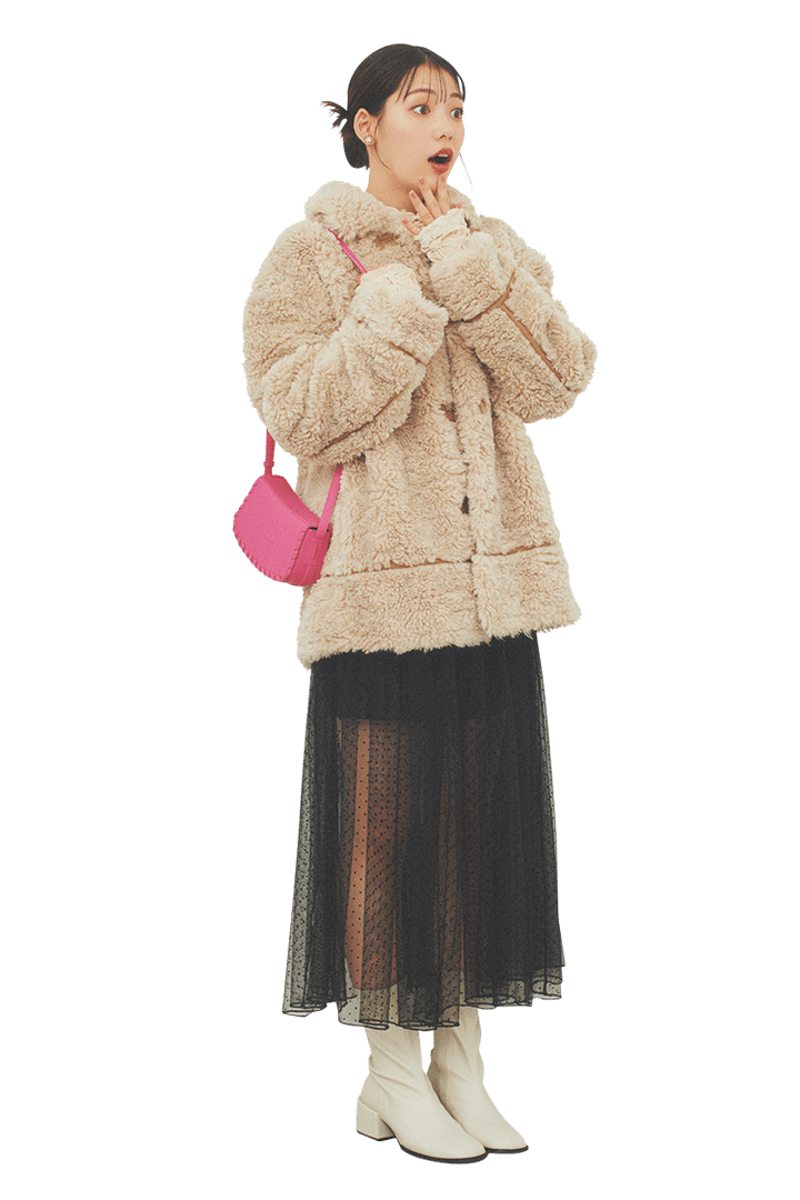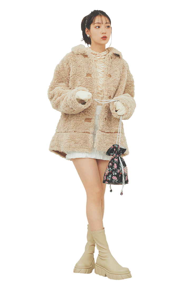 テディベアのような見た目にきゅん。ミニのボトムと相性のいいハーフ丈が◎。もふもふファーが男心をくすぐる♡