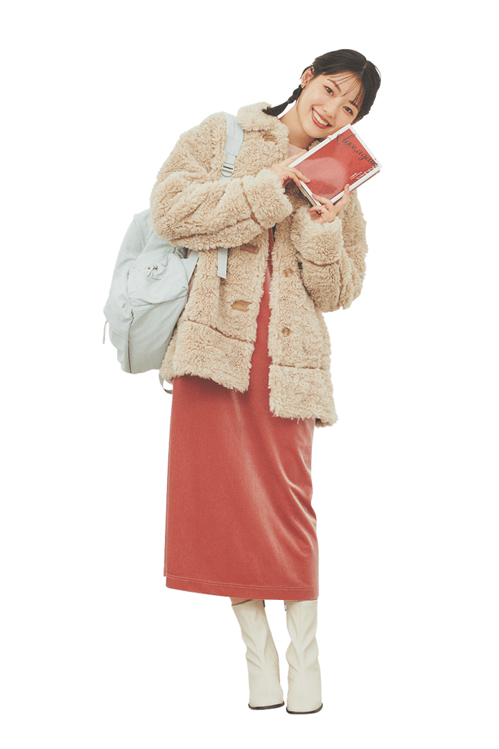 コートは着回し。ベロアキャミワンピース 10,780円/LILLIAN CARAT(リリアン カラット) リブニットトップス 8,980円/épine イヤリング 2,420円/アネモネ(サンポークリエイト) リュック 14,548円/STAND OIL(MUSINSA GLOBAL STORE) ブーツ 26,400円/エフ バイ ウェルフィット(ダイアナ 銀座本店)