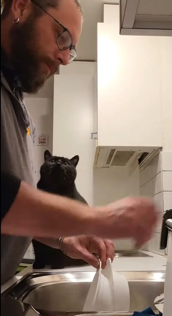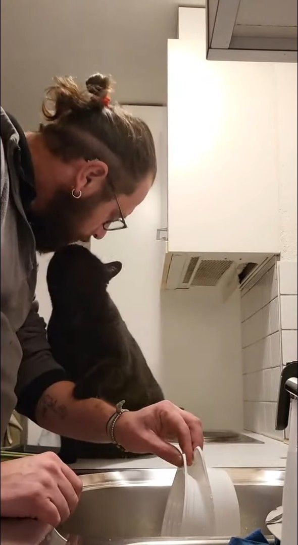 3. 黒猫がするキスのおねだりがかわいすぎる!お皿を洗う飼い主さんの腕におててを添えて・・、ぐっと上目づかいで甘えています!!