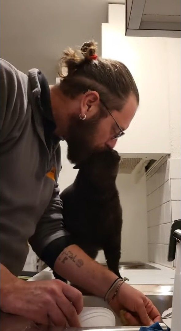 黒猫がするキスのおねだりがかわいすぎる!お皿を洗う飼い主さんの腕におててを添えて・・、ぐっと上目づかいで甘えています!!