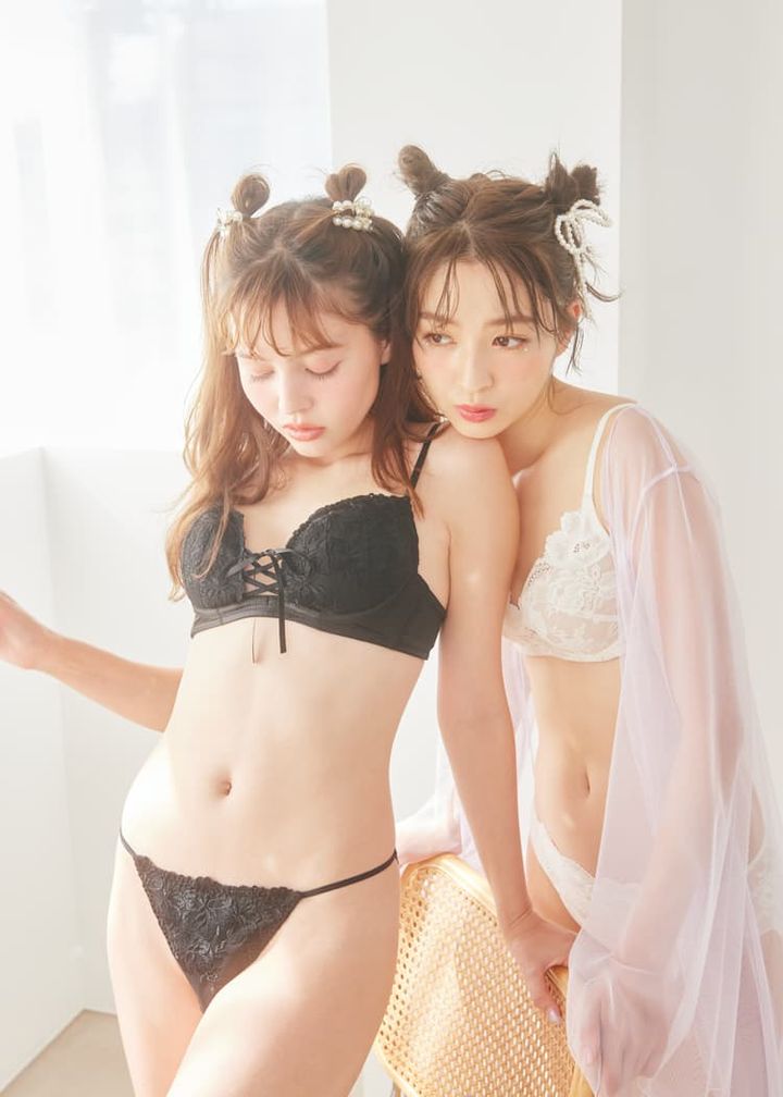 〈せいら〉白レースブラ 3,900円、ショーツ 1,800円/ともにPEACH JOHN ラベンダーガウン 9,878円/RAVIJOUR(ラヴィジュール ルミネエスト新宿店) ヘッドアクセ/スタイリスト私物〈ナナ〉黒レースブラ 5,379円、ショーツ 3,509円/ともにRAVIJOUR(ラヴィジュール ルミネエスト新宿店) ヘッドアクセ、シアーソックス/ともにスタイリスト私物